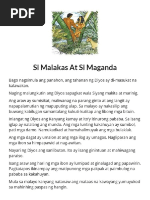 Ang kwentong bayan na Si Malakas at si Maganda ay parang kwento nina Adan at Eba. MagandaMalakasBathala ng langit Bathala Diyosa ng karagatan. Muli siyang nakiusap sa ibon na tuktukin pa ang isa pang kawayan upang makalabas ang kasama niya sa loob.